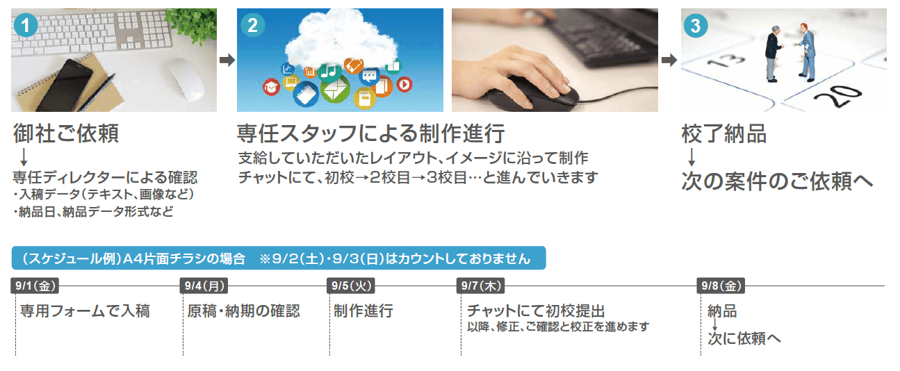※日数は入稿日の翌日を1日目として土曜・日曜・祝日をカウントせずに数えた日数です。納品物が土曜・日曜・祝日にあたる場合は、その翌日となります。