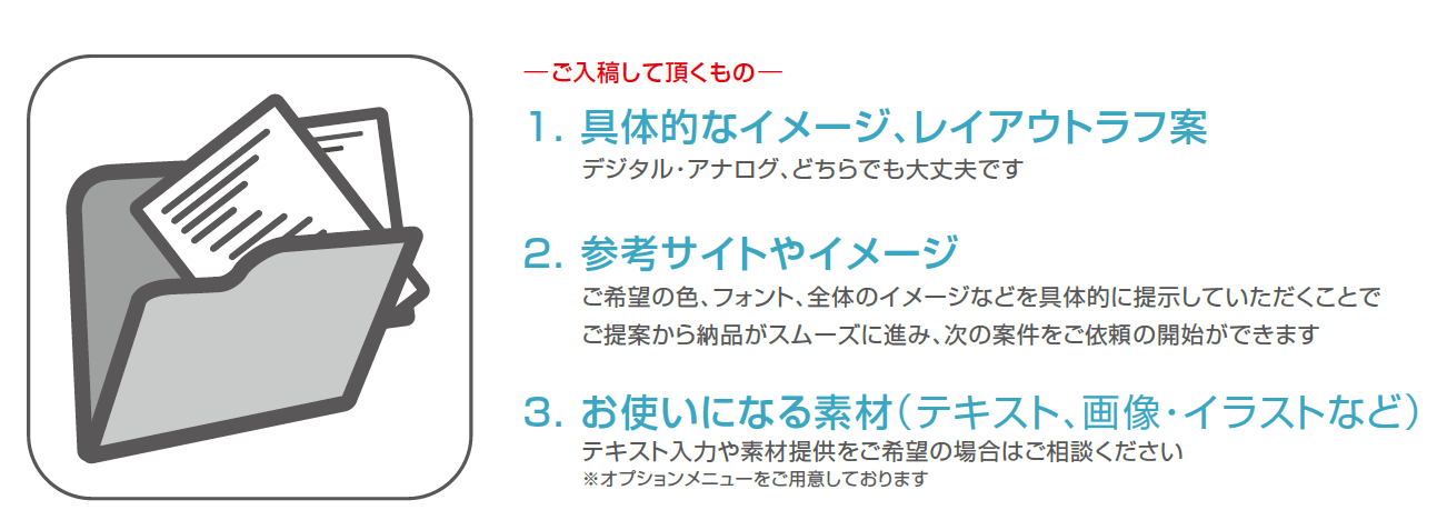 原稿の添付と、ご希望のデザイン、構成、スケジュールなどをお知らせください。